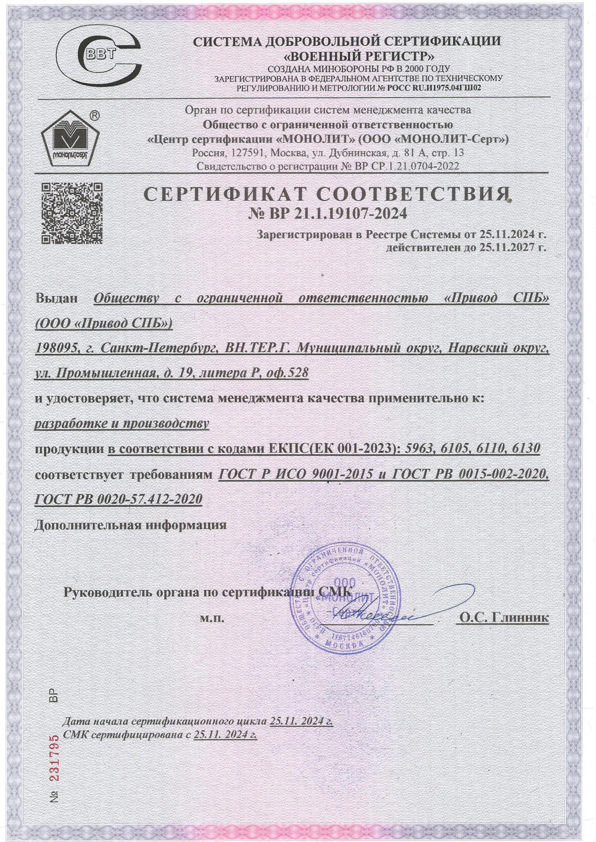 СМК соответствует «Военному регистру» — подтверждение качества процессов разработки и производства.
